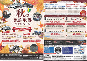 アイルモータースクール門司のお得なキャンペーン実施中です。詳細はチラシをご覧ください。